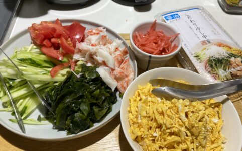 いつも応援ありがとうございます。 冷やし中華 昨日、冷やし中華を作った。麺は1人前ずつだったけど具は5人前くらい。 夫が糖尿病でその上 肉嫌いなので、具はワカメ・きゅうり・トマト・カニかまぼこ・卵焼き...