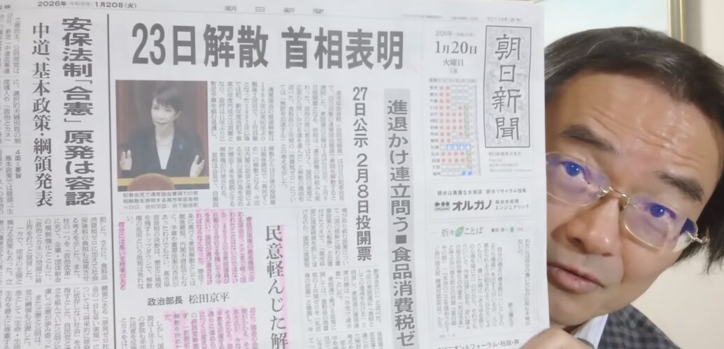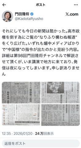 媚中派(中国寄り)の新聞、朝日新聞・毎日新聞はなんと新聞全面を使って高市批判をしたとのこと。