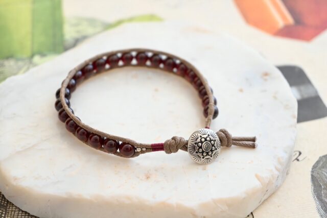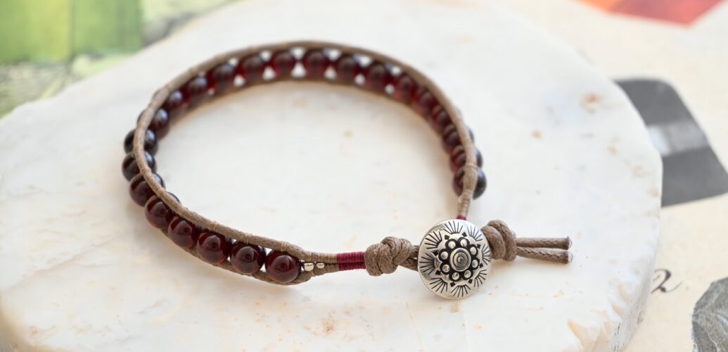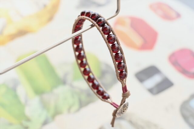 娘がいろいろな石を検索してくれて、ガーネットの深い赤のブレスレットを作ってくれた。