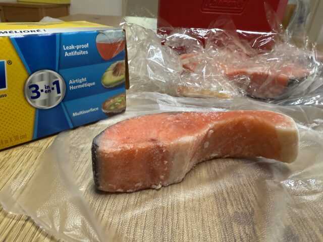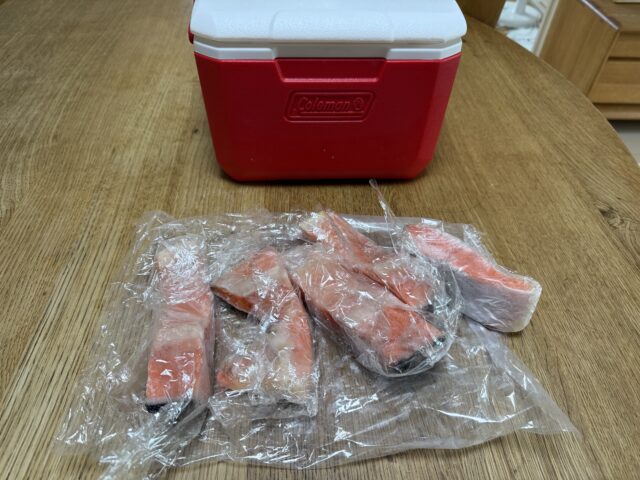 「あのな。うまい鮭 買ったんじゃわ。ちょっと前に買って うまかったから また昨日買って冷凍したんよ。食べてみるかえ?きょう来たらあげるわ」