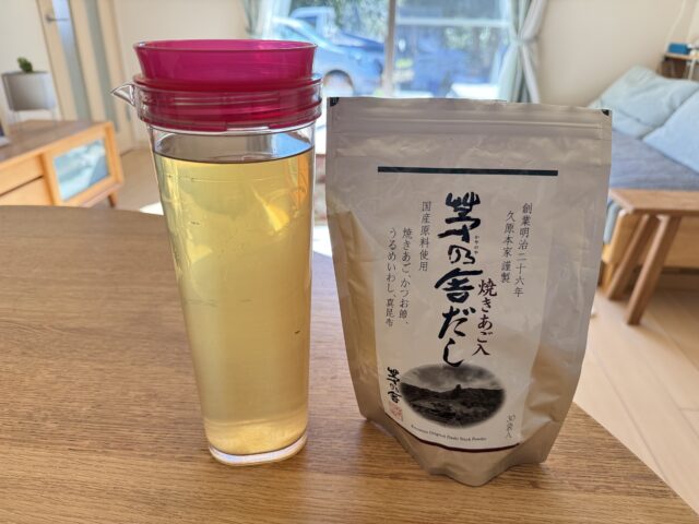 焼あご入りのだしは、煮だしておいて冷蔵庫にいれてある。