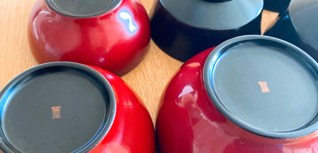 黒い方が水平赤い方が日月と名付けられた三つ組み椀です。
