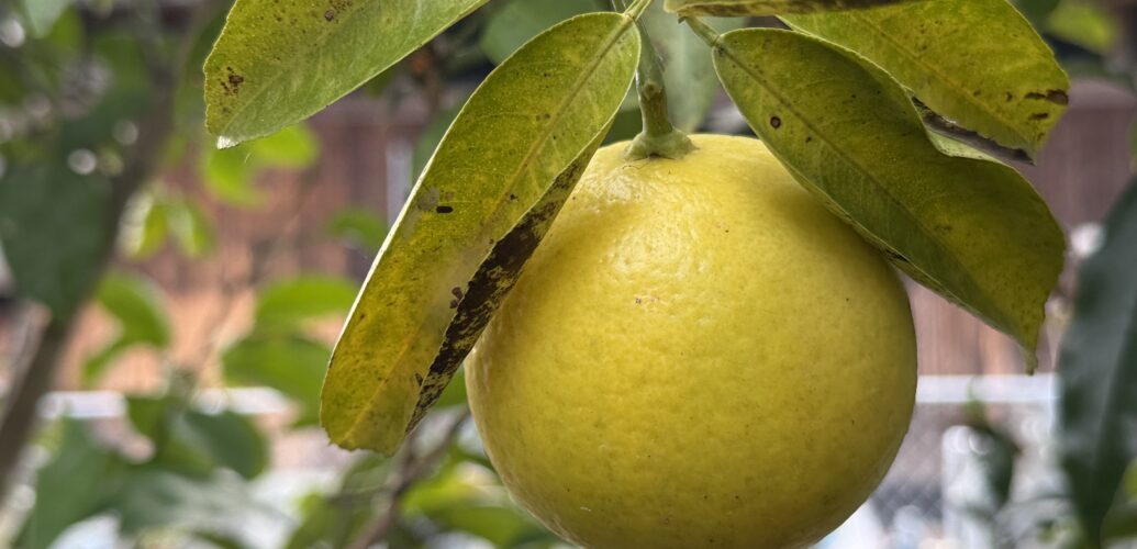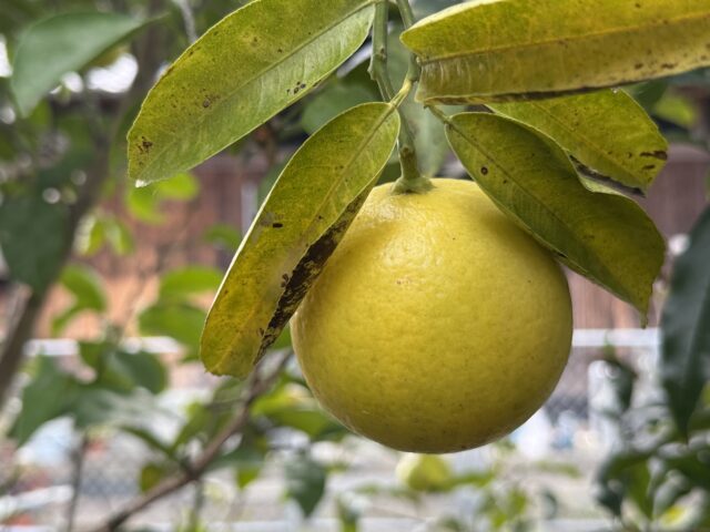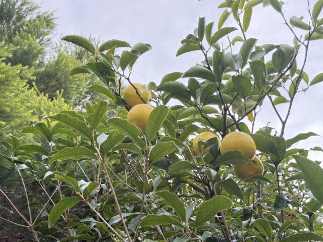 庭に、二種類のレモンの木があるが、なぜか普通のレモンは実が生っていなくて、丸いレモンのみ生っている。