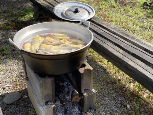 夫と二人でベンチに座り、アイスを食べたりビールを飲んだりしながら茹でました。