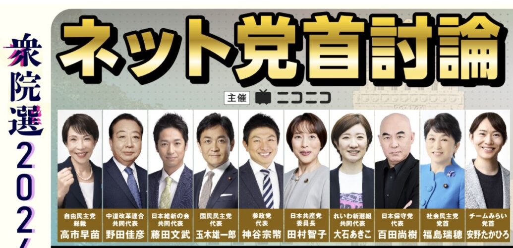 自由民主党総裁 高市早苗・中道改革連合共同代表 野田佳彦・日本維新の会共同代表 藤田文武・国民民主党代表 玉木雄一郎・参政党代表 神谷宗幣・日本共産党委員長 田村智子・れいわ新選組共同代表 大石あきこ・日本保守党代表 百田尚樹・社会民主党党首 福島瑞穂・チームみらい党首 安野たかひろ