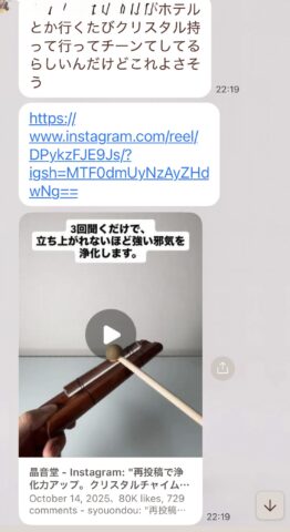 すごく良い音のクリスタルチャイムの動画付きでLINEしてきた。