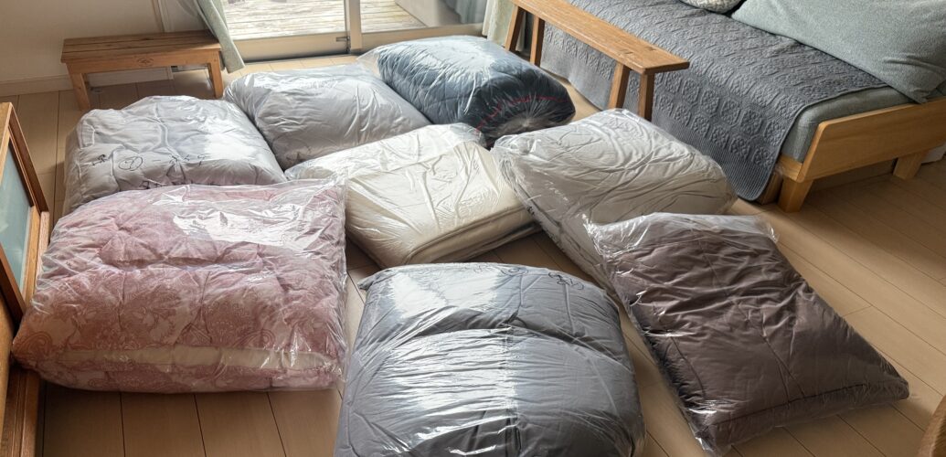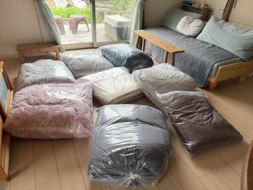 持ち帰って1袋開けて昨夜掛けて寝たけれど、あと残ったこれらがなぜか押し入れに入らず困っている。