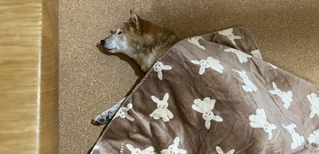 コロ助ちゃんの毛布(ひざ掛けでしょうか)いつもかわいい。