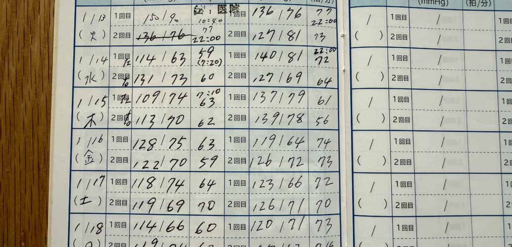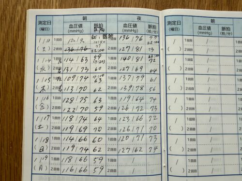「こんど来院する時に持って来て」と血圧手帳をもらったので毎日 測って書いている。