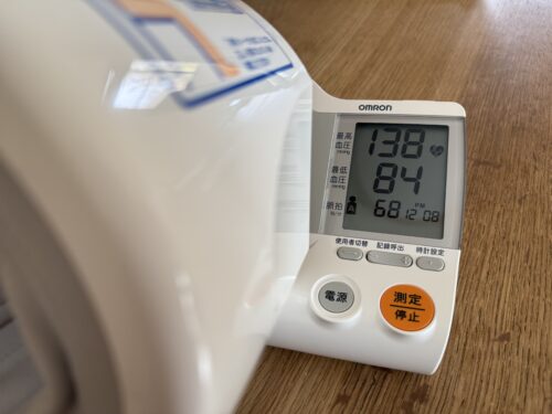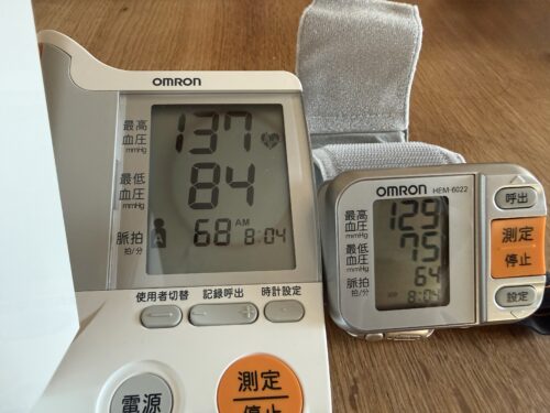 食後に上腕式血圧計と手首式血圧計の両方で測ってみた。