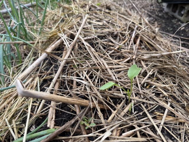 今朝 畑を見回ったら、先日じか蒔きした種から 芽が出ていた。