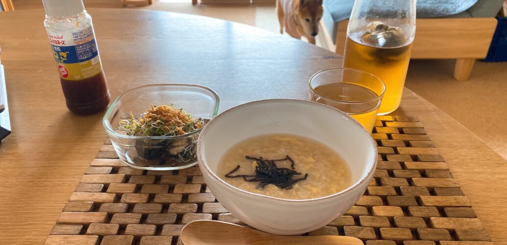 朝食兼昼食は、備蓄品で期限切れ間近の卵雑炊とサバの水煮缶を食べました。
